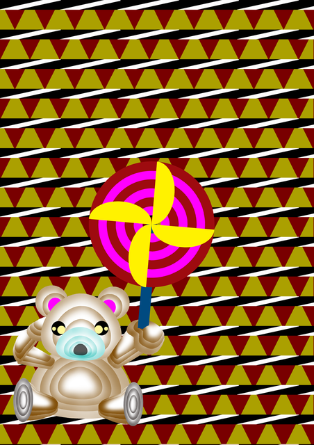 背景はエンジ色と黄土色の三角形のマスで描いて