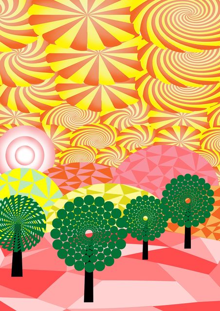 山と地面はキイロ系とアカ系の円のデザインで描いています。