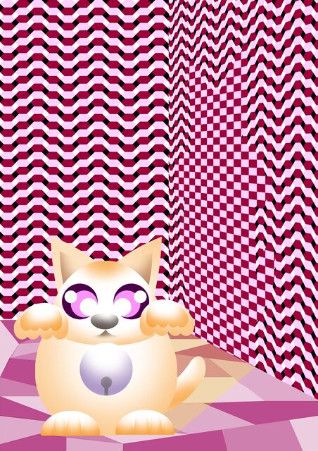背景はアカとピンクの四角形のマスを並べ描いて、