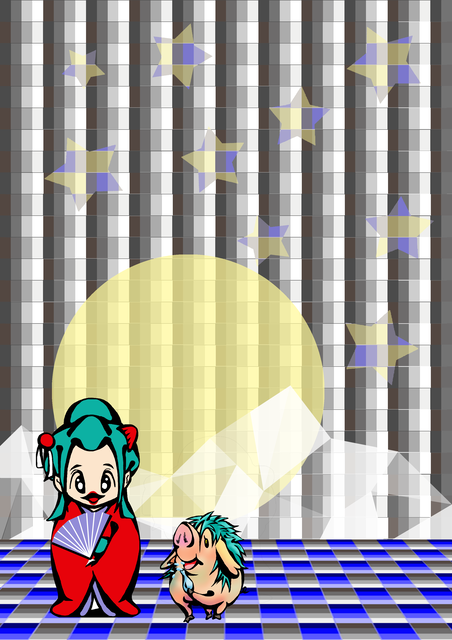 星達は透明度のあるアオとキイロの長方形のマスで並べ描いています。