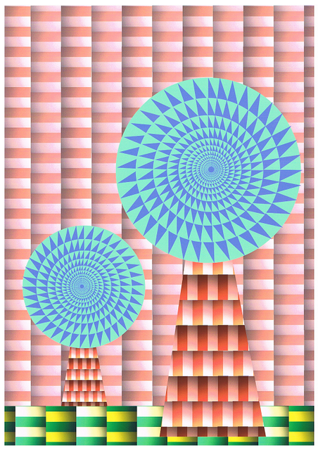 円の中に配列している青の直角三角形の模様が二重・・三重に見えたり・・・・